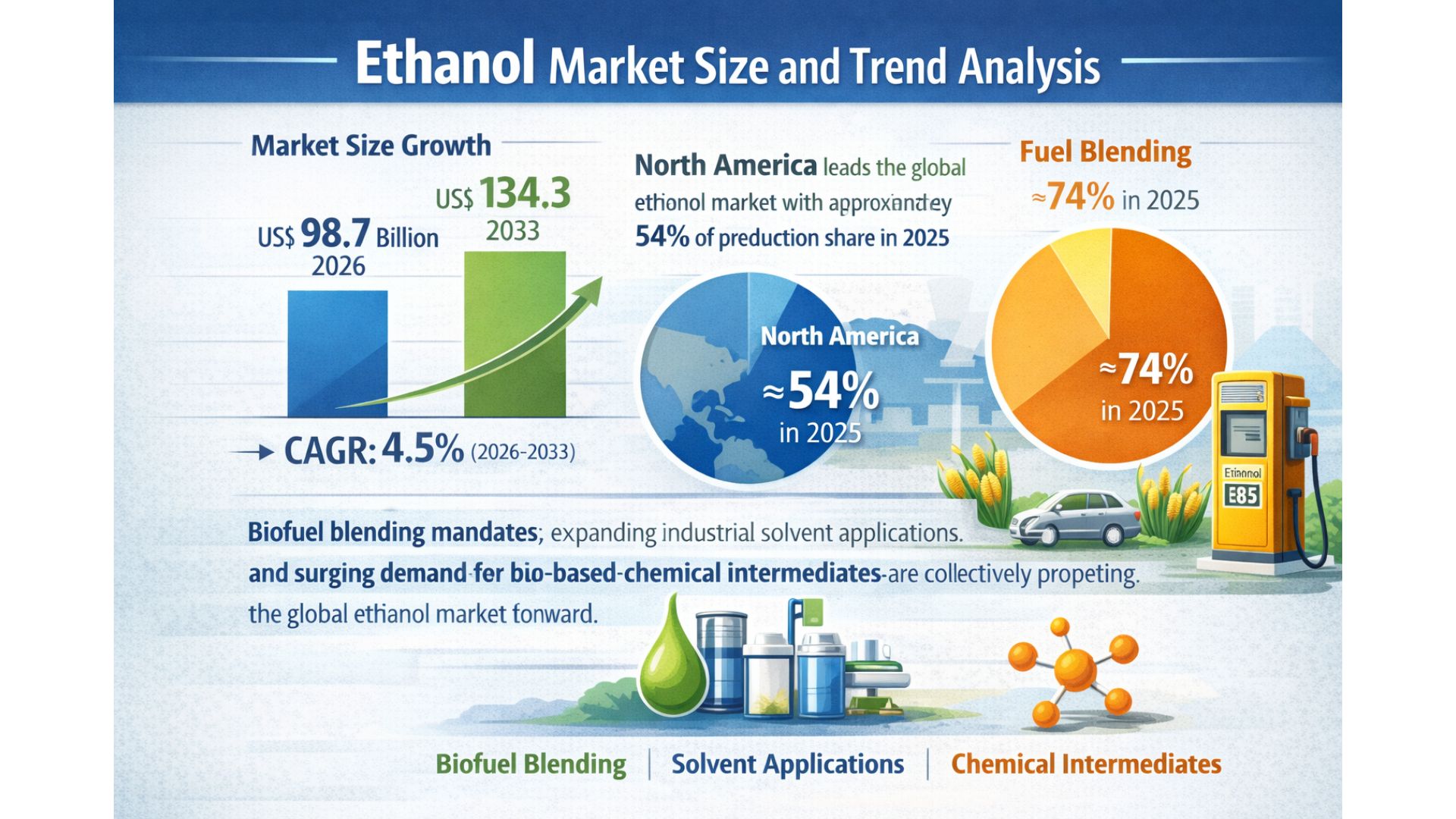 LONDON, LONDON, UNITED KINGDOM, March 17, 2026 /EINPresswire.com/ -- The global ethanol market is witnessing steady and transformative growth as industries and governments accelerate their shift toward cleaner, renewable energy solutions. According to the latest study by Persistence Market Research, the ethanol market is projected to expand from US$ 98.7 billion in 2026 to US$ 134.3 billion by 2033, registering a CAGR of 4.5% during the forecast period. This upward trajectory is largely attributed to increasing biofuel blending mandates, growing industrial solvent applications, and the rising demand for bio-based chemical intermediates across diverse sectors.