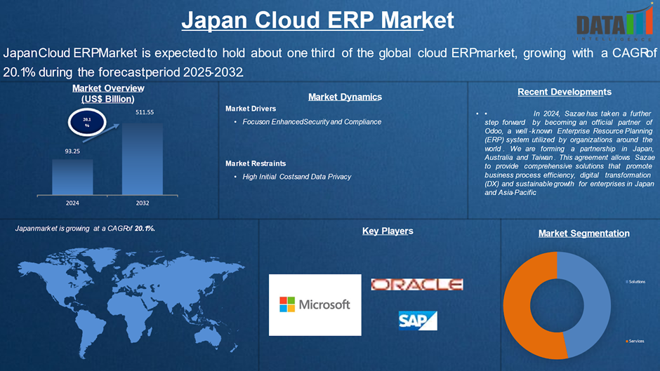 According to DataM Intelligence, The Japan Cloud ERP (Enterprise Resource Planning) Market is poised to capture approximately one-third of the global cloud ERP market share, with a projected Compound Annual Growth Rate (CAGR) of 20.1% from 2025 to 2032. This robust growth is fueled by several key factors, including government initiatives promoting digital transformation, the adoption of artificial intelligence (AI) and machine learning for predictive analytics, and the increasing need for businesses to adapt to a rapidly changing economic landscape.